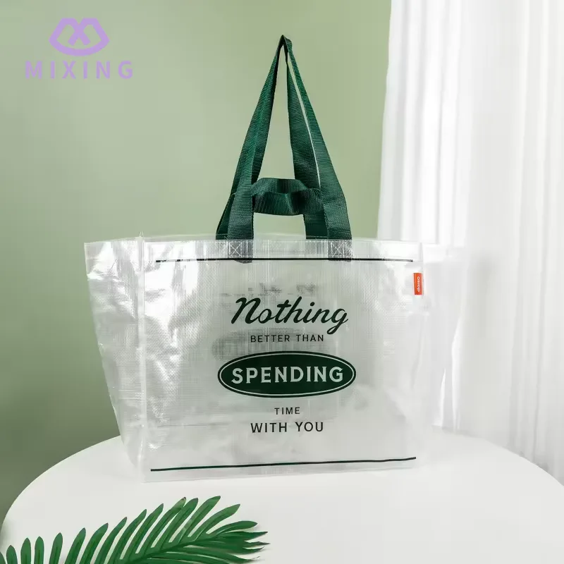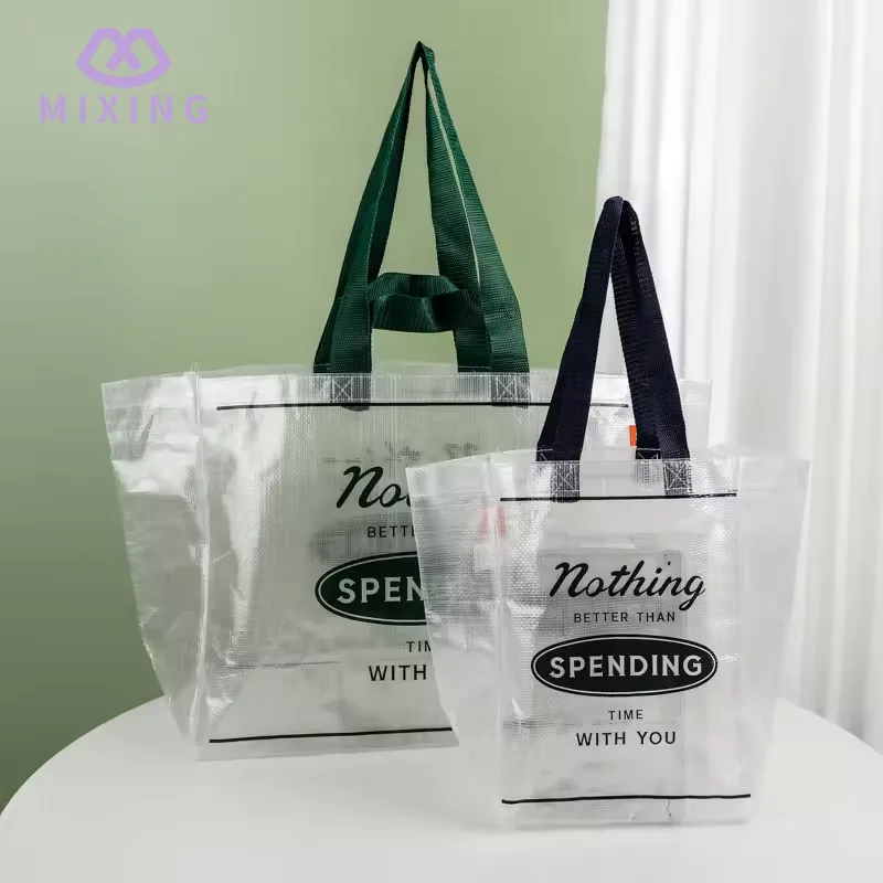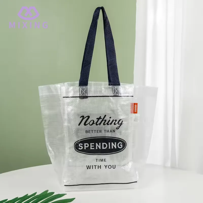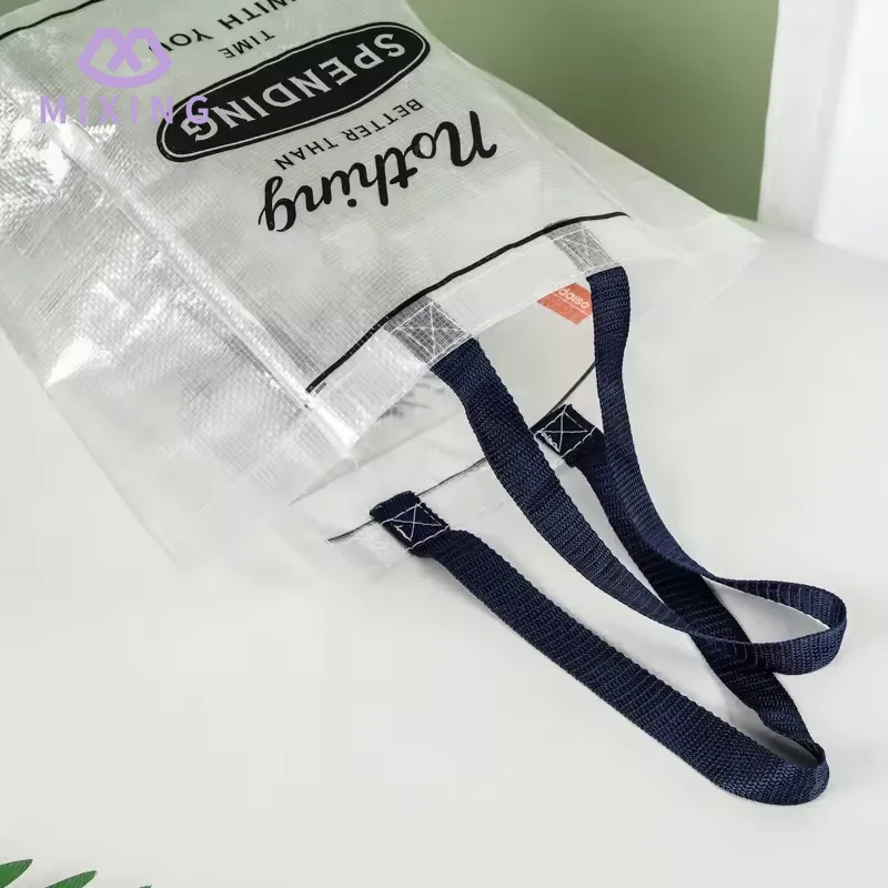 Der Handtrageteil der China Clear PP Woven Tote Bag von Mixing ist mit einem verbreiterten Nylonriemen ausgestattet. Das Nylonmaterial ist mäßig weich und hinterlässt bei Kontakt mit der Hand keine Spuren. Die Tragfähigkeit wurde mehrfach getestet und kann ohne Verformung stabil getragen werden.